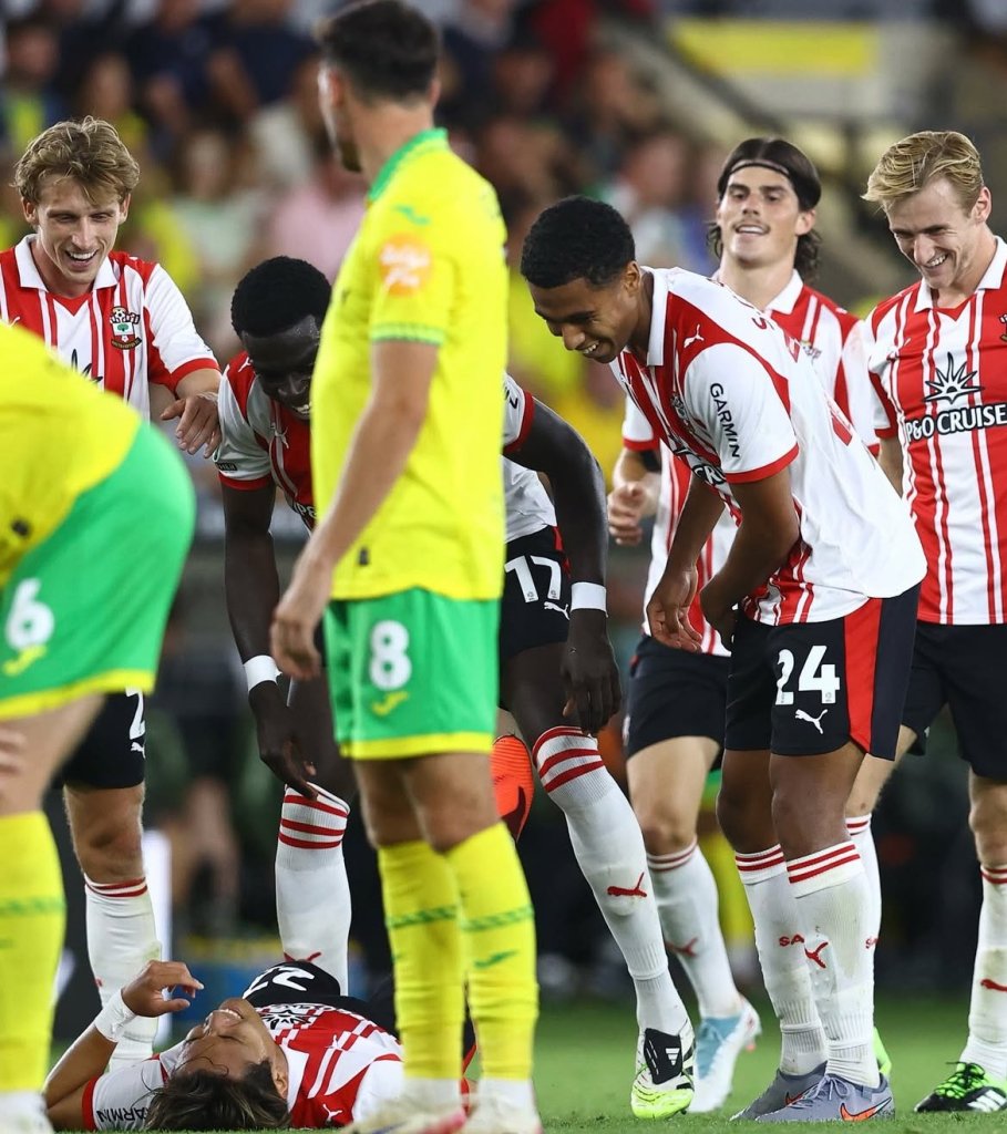 A Saints attack breaks down when Flynn Downs tries another blind flick round the corner but Norwich overplay and a pass goes astray to Stewart who passes it into Archer’s feet, one touch before curling it left footed around the defender and into the top corner. Brilliant finish from one of our only decent players in this first half. We don’t deserve it but we will take it.