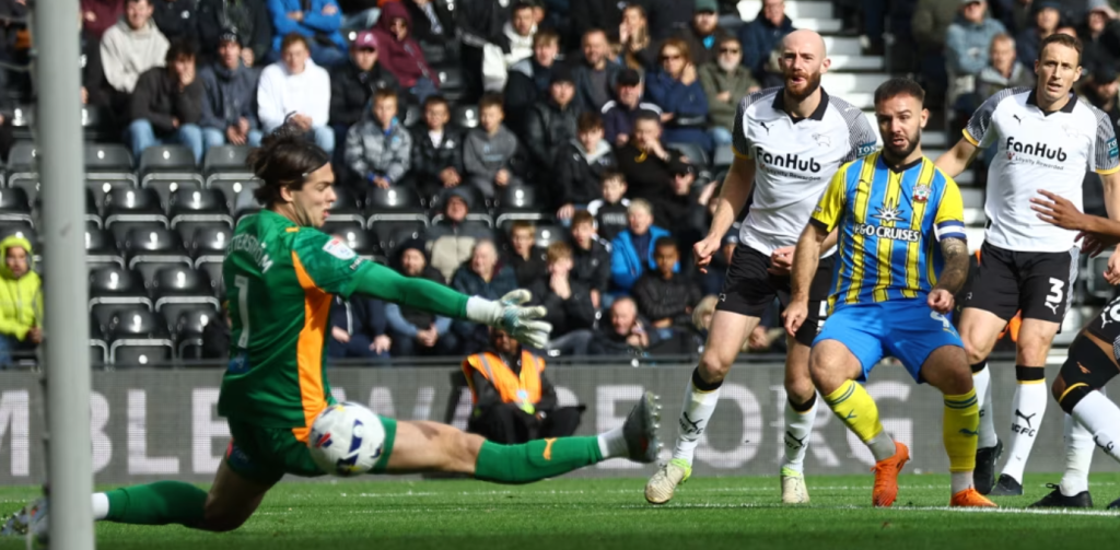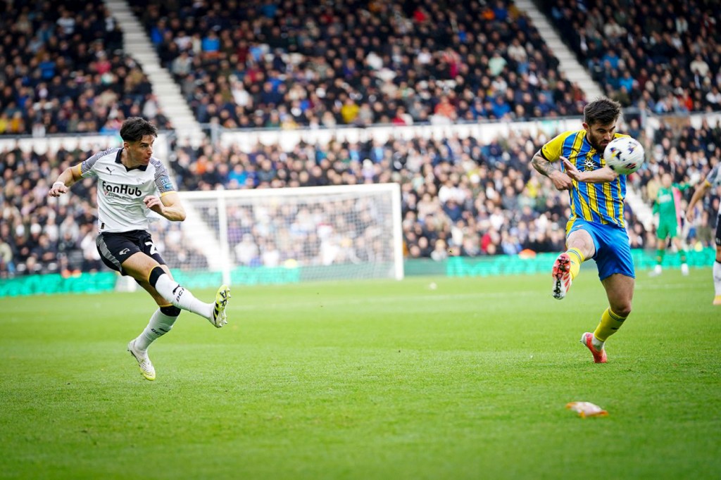 Derby’s twin-donkey defence of ex-Skate Matt Clarke and Dion Sanderson can’t deal with our movement and speed of play at all and in the resulting confusion, following more good link play by Stewart, Scienza gets carted on the right side of the penalty area. It’s prime Irish-Bale territory and it’s decent by Manning, up and over the wall at the near post but Zetterstrom pulls off a save for the cameras.