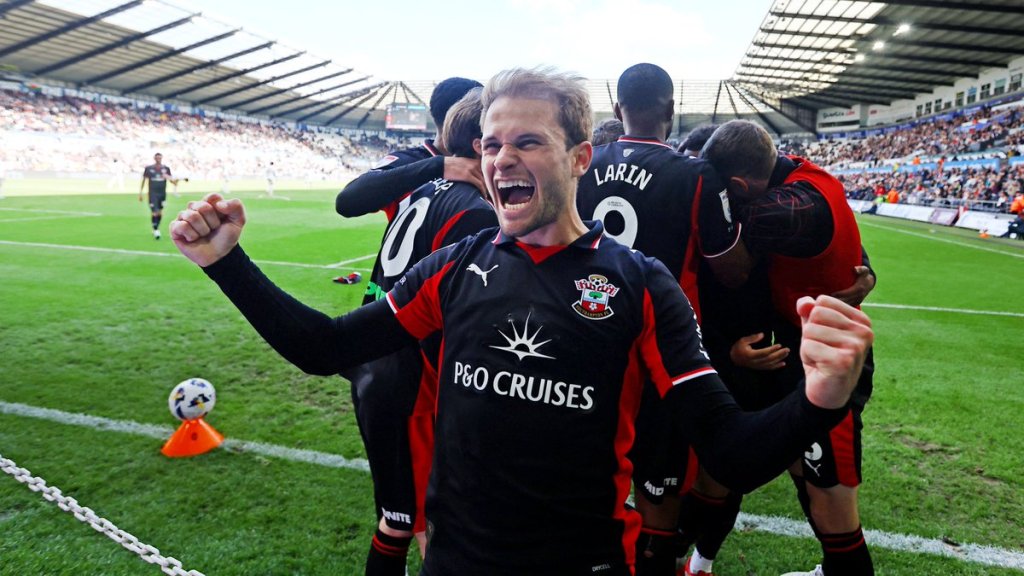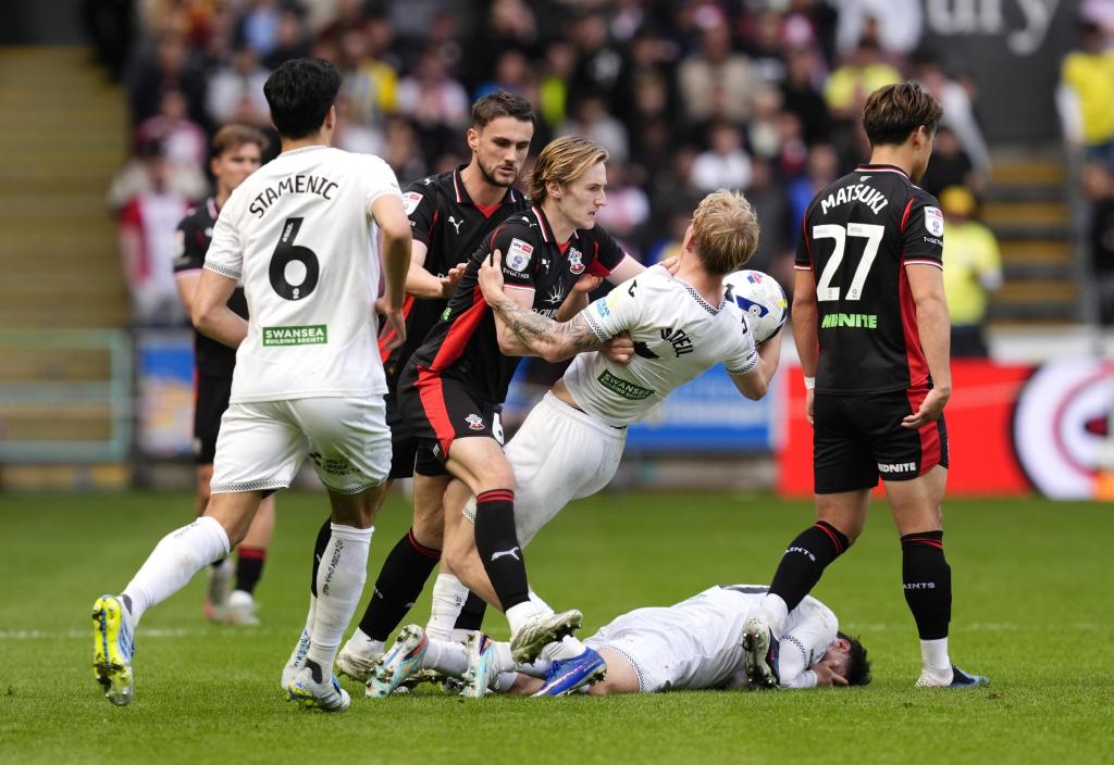 So, another trip to Wales, this time to the South-West and whenever Saints and Swansea are in same conversation, the name of Russell Martin inevitably comes up. Russell lead Swansea to two mid-table finishes before getting the Saints job and there are some familiar players to the Swansea fans in our squad at the moment, namely Flynn Downes, Ryan Manning and Nathan Wood. Swansea‘s best player of recent seasons was Matt Grimes but he has moved on to Coventry and one assumes he will be a Premier League footballer next season. Swansea replaced him with Ethan Galbraith this season and the Northern Irishman has made a decent fist of filling that particular hole. He will be missing this afternoon, though with a season ending injury, which is certainly to our advantage. One player who will be a threat to us today is Zan Vipotnik, who is the top scorer in the Championship this year, with the majority of his goals coming at the Liberty Stadium. He was on the scoresheet away from home last week, as Leicester committed their entire team forward for a free kick before passing straight to the nearest Swansea player, who went straight up the other end of the pitch in about five seconds and Vipotnik crashed the ball into the top corner.